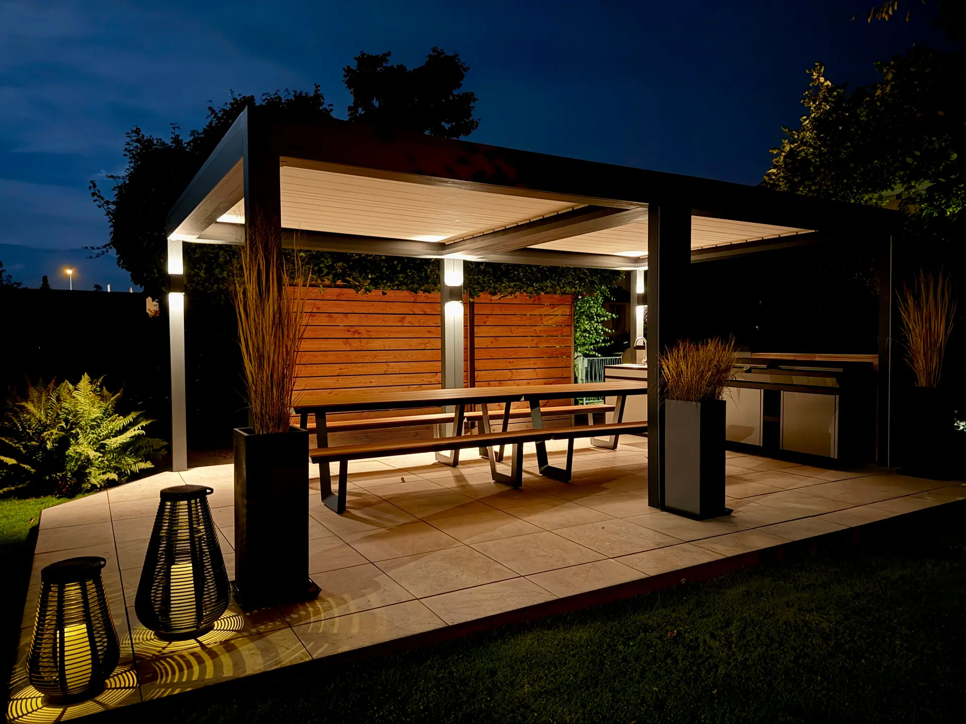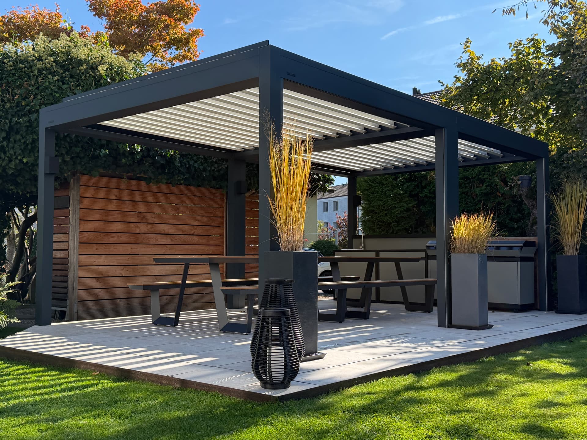Du suchst nach der richtigen Überdachung, bist dir aber noch nicht sicher, welche Optionen für dich in Frage kommen? Unser 3D-Simulator führt dich durch alle Wahlmöglichkeiten. Wähle deinen Dachtyp - z. B. ein Stoffdach oder ein Lamellendach - und entscheide, ob ein angebautes oder ein freistehendes Modell für dich in Frage kommt. Gib deine Abmessungen ein und füge zusätzliche Optionen hinzu, z. B. Seiten-Screens oder Beleuchtung. Du kannst auch mit der Farbe spielen. Stil-Tipp: Wenn du die Farbe deiner Überdachung an die Farbe deiner Fenster anpasst, erhältst du ein schönes, einheitliches Gesamtbild.