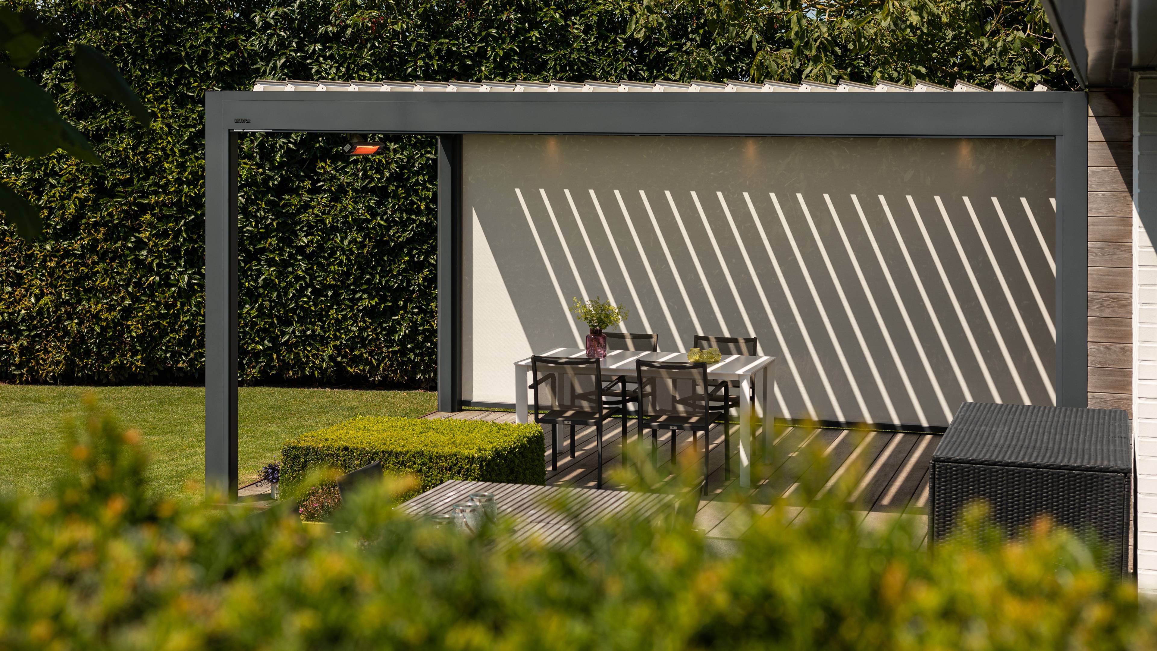In summer, their home’s central meeting place moves outside. Under the patio cover, the screens keep out wind and bright sun. When the barbecue is on and the table is set, the mood is always sunny. Even when Belgian summer weather is at its most erratic.