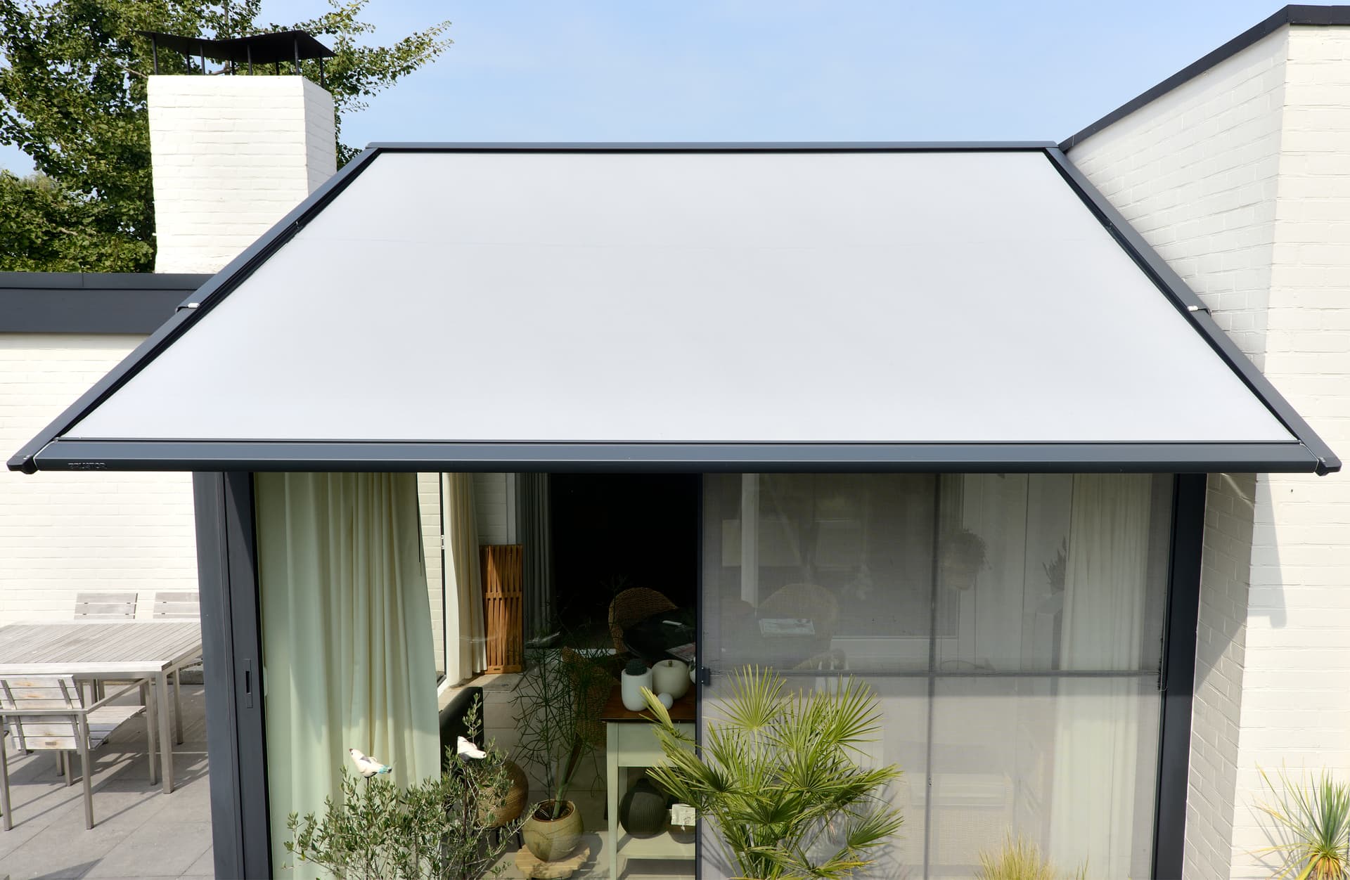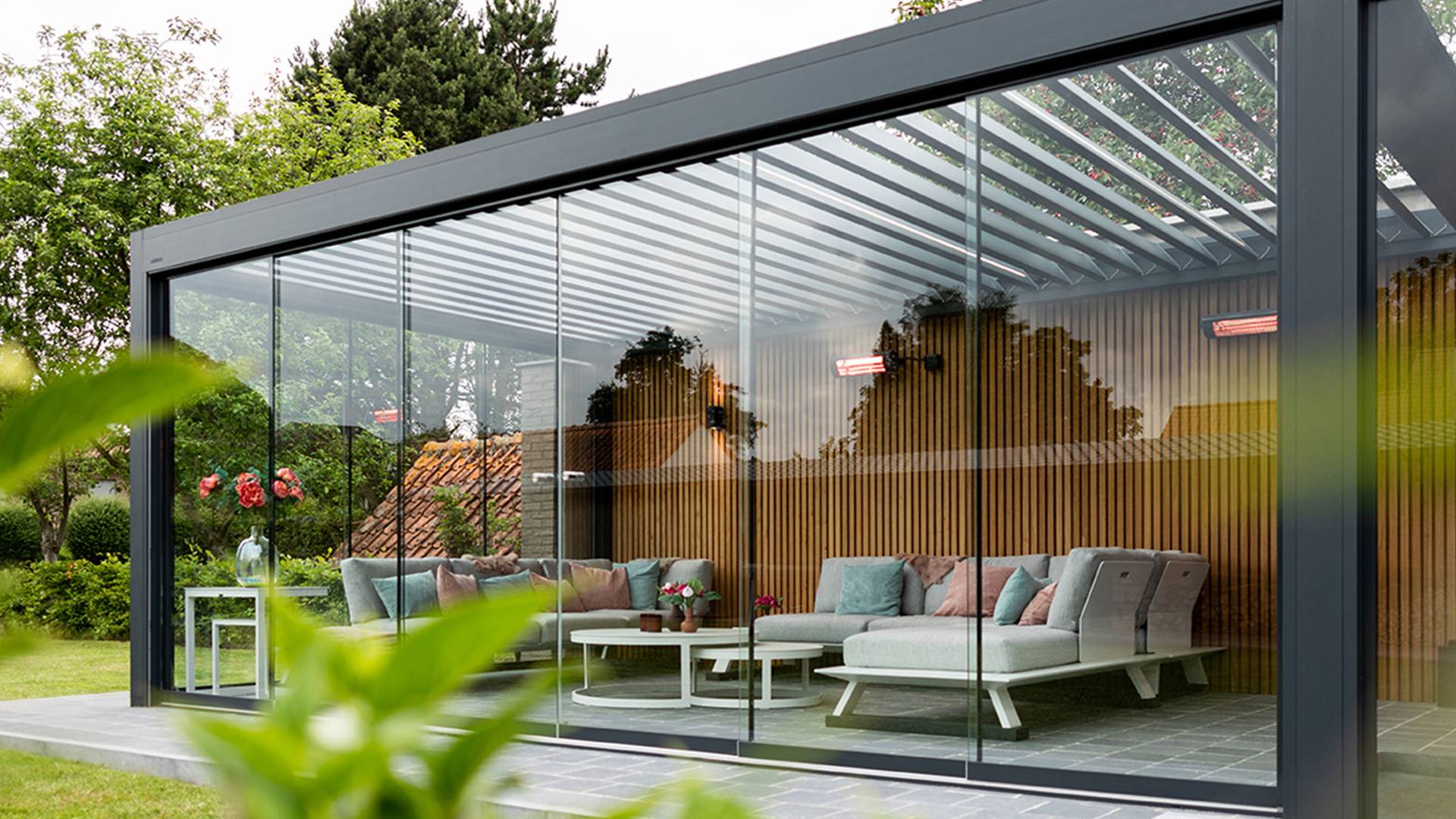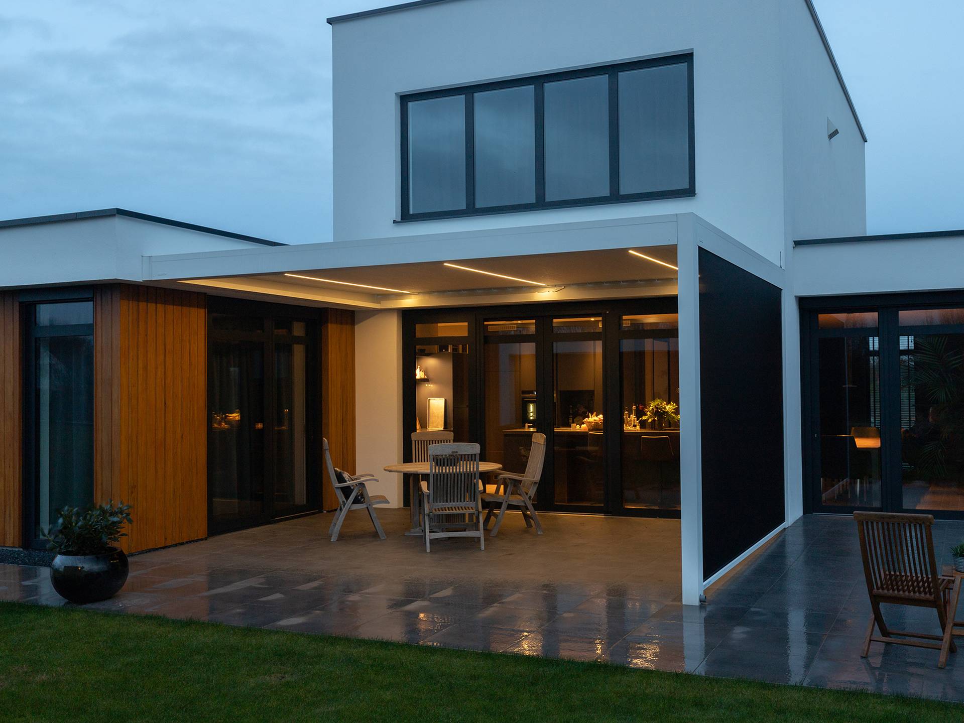 Les gouttières intégrées évacuent l’eau de pluie de manière contrôlée via les poteaux. Et en l’équipant de screens ou de parois coulissantes latérales, vous êtes encore mieux protégé contre la pluie. Une pergola avec toit fixe est idéale pour garder vos meubles ou vos vélos au sec, même lors d’une journée d’automne maussade.
