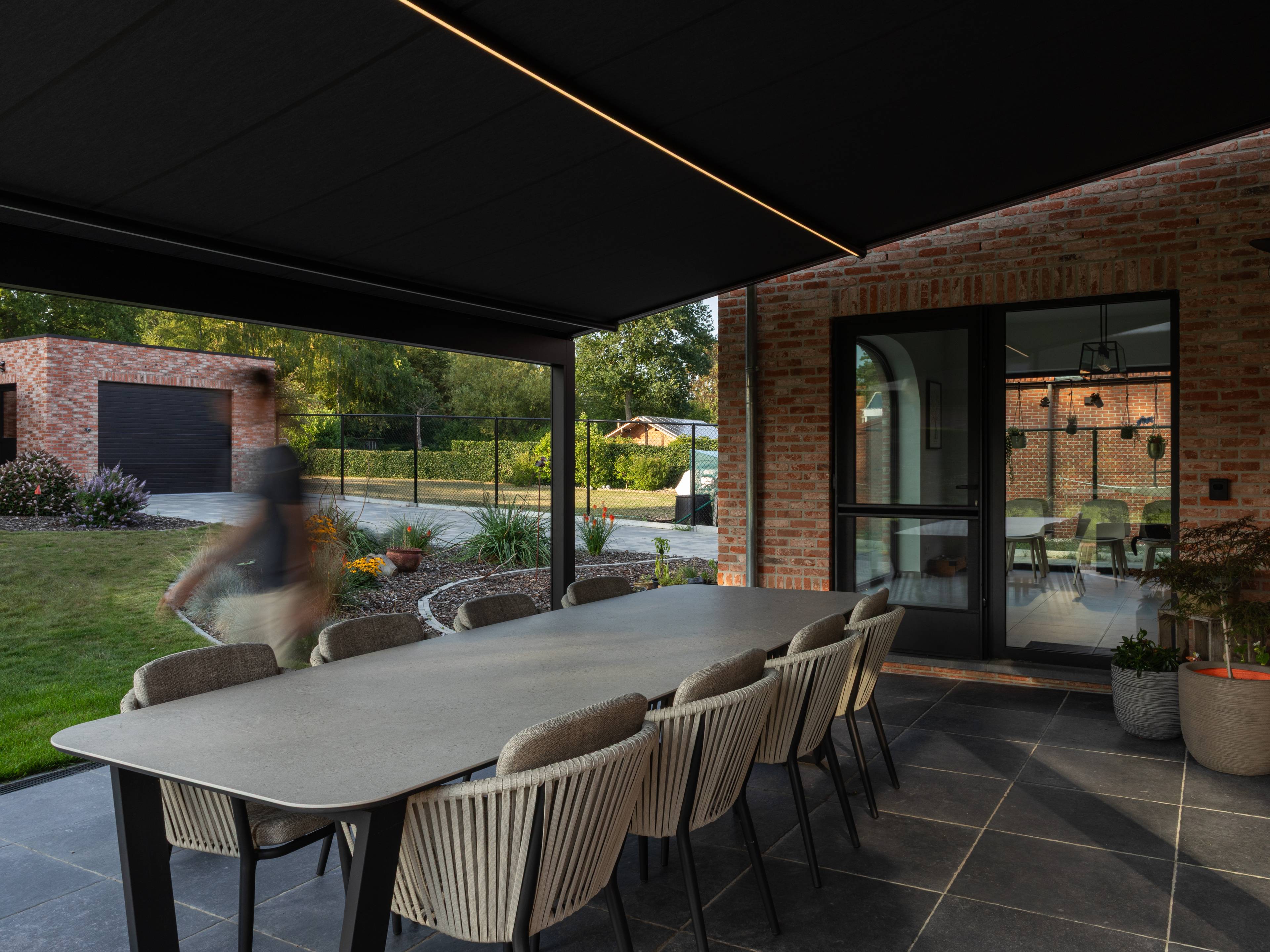 La B128 XL è la sintesi perfetta tra due mondi. Una pergola con tessuti screen integrati che scompaiono completamente nella struttura, per godere appieno dei vantaggi di una tenda da sole e di una copertura per esterni. La B128 viene sempre addossata alla casa, con il telo che si arrotola o si srotola elettricamente grazie all’affidabile tecnologia ZIP screen. Questo sistema garantisce che il telo rimanga sempre in tensione all’interno delle guide anno dopo anno.